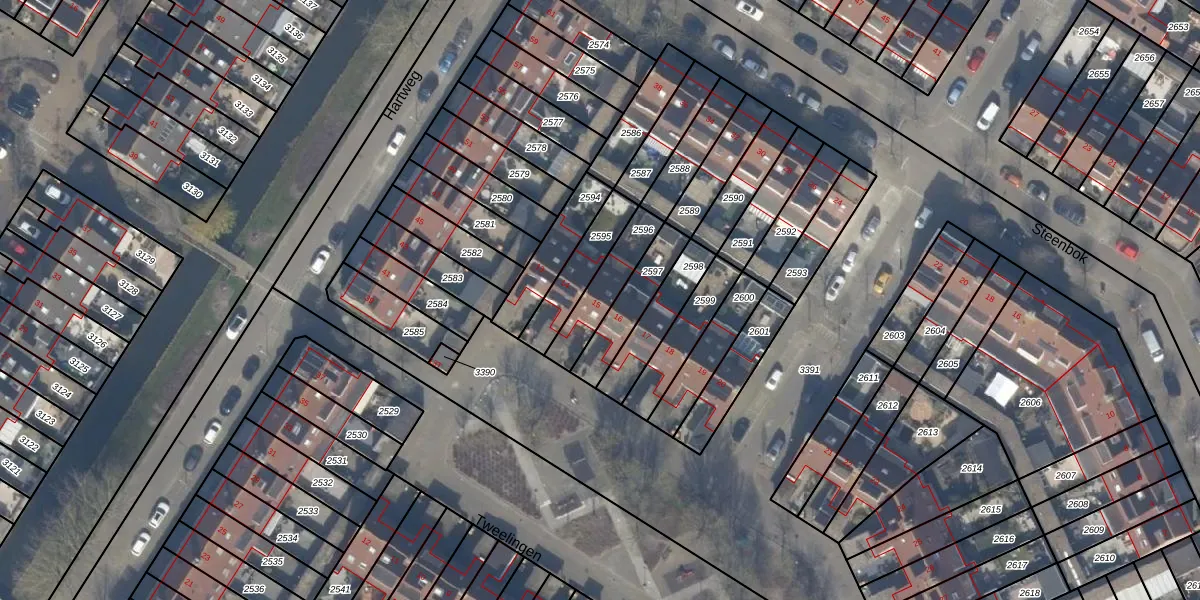Gebruik de zoekbalk of klik op een perceel voor informatie over de adressen binnen dit perceel.