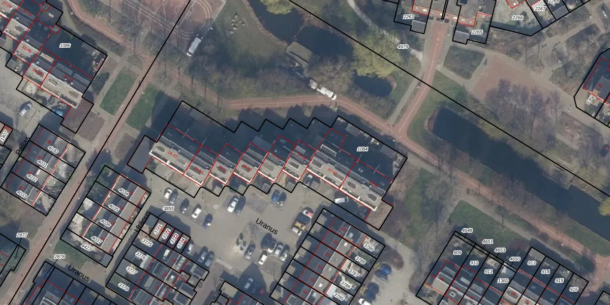 Het perceel waarop Uranus 36 staat heeft een oppervlakte van 1922 m². Dit is een zeer groot perceel. De perceeloppervlakte wordt geregistreerd door het Kadaster. Gedetailleerde informatie over de maten van dit perceel kunt u vinden in het rapport Kadastrale kaart met maatvoering van Uranus 36.