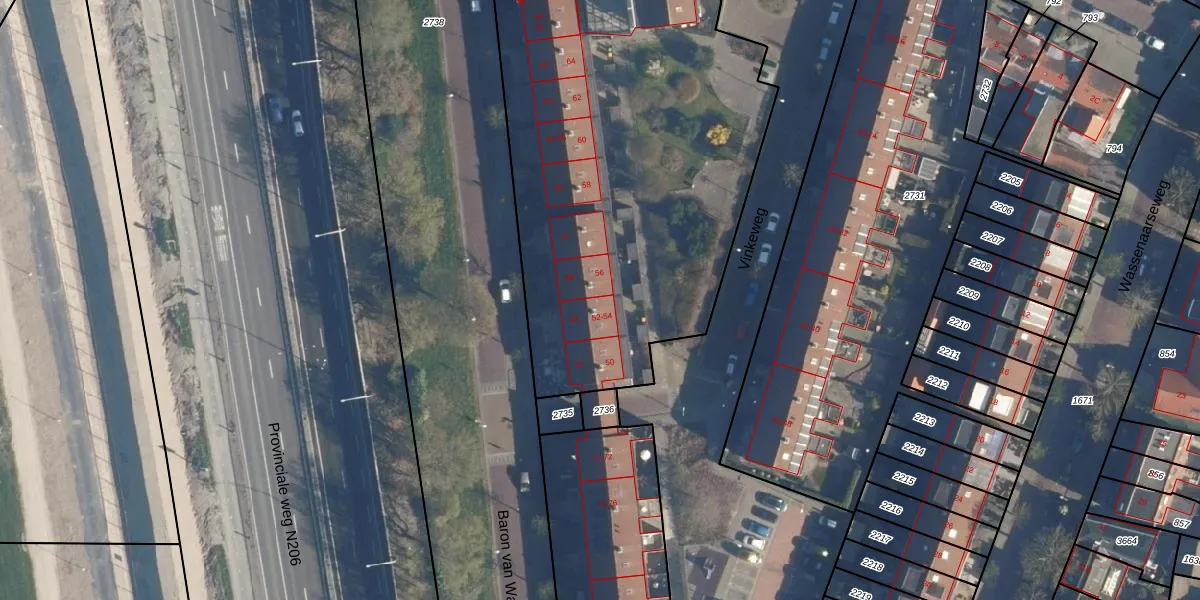 Vinkeweg 54 is gelegen op kadastraal perceel KWK01D2733. Deze kadastrale aanduiding is uniek en wordt gebruikt door het Kadaster om eigendomsrechten en andere zakelijke rechten vast te leggen. Het perceel maakt onderdeel uit van de kadastrale gemeente Katwijk.