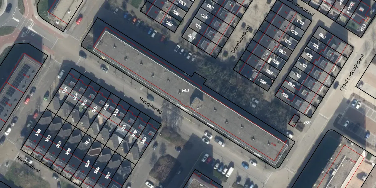 Het perceel waarop Vreugdeweg 12-C staat heeft een oppervlakte van 2188 m². Dit is een zeer groot perceel. De perceeloppervlakte wordt geregistreerd door het Kadaster. Gedetailleerde informatie over de maten van dit perceel kunt u vinden in het rapport Kadastrale kaart met maatvoering van Vreugdeweg 12-C.