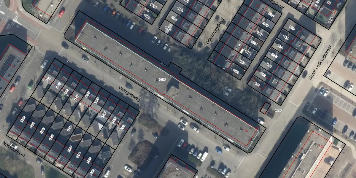 Het perceel waarop Vreugdeweg 74 staat heeft een oppervlakte van 2188 m². Dit is een zeer groot perceel. De perceeloppervlakte wordt geregistreerd door het Kadaster. Gedetailleerde informatie over de maten van dit perceel kunt u vinden in het rapport Kadastrale kaart met maatvoering van Vreugdeweg 74.