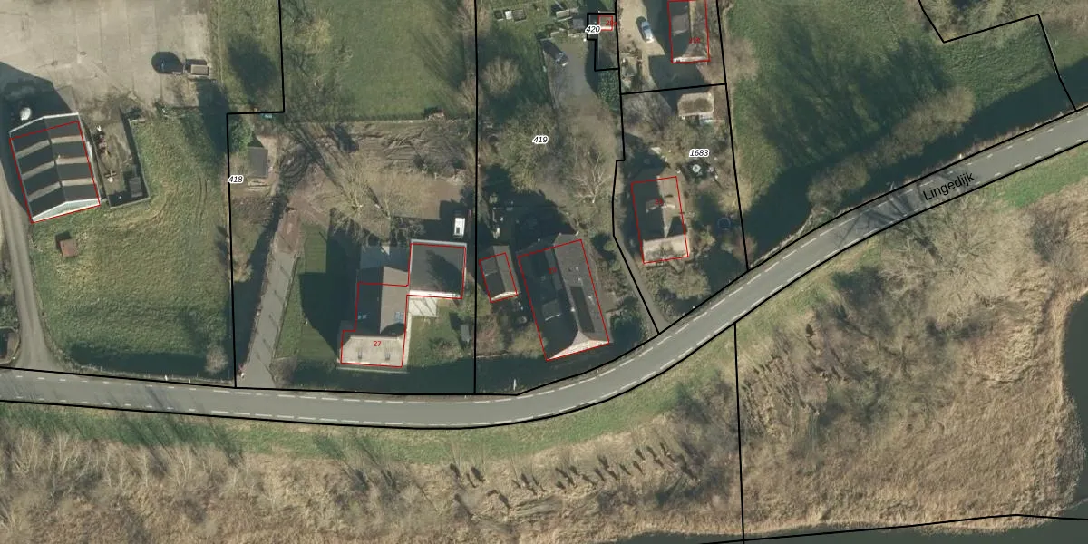 Lingedijk 29 is gelegen op kadastraal perceel LDM00K419. Deze kadastrale aanduiding is uniek en wordt gebruikt door het Kadaster om eigendomsrechten en andere zakelijke rechten vast te leggen. Het perceel maakt onderdeel uit van de kadastrale gemeente Leerdam.