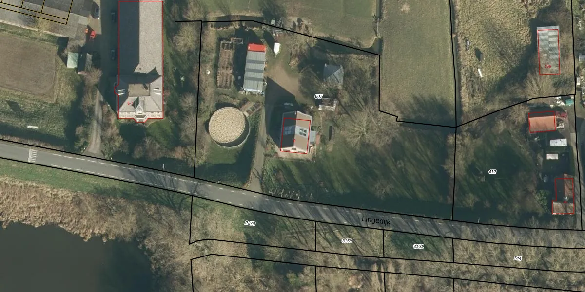 Het perceel waarop Lingedijk 9 staat heeft een oppervlakte van 4325 m². Dit is een zeer groot perceel. De perceeloppervlakte wordt geregistreerd door het Kadaster. Gedetailleerde informatie over de maten van dit perceel kunt u vinden in het rapport Kadastrale kaart met maatvoering van Lingedijk 9.
