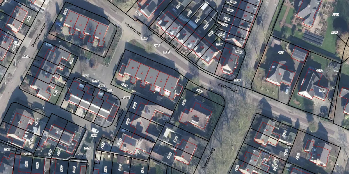 Het perceel waarop Kerkstraat 46 staat heeft een oppervlakte van 868 m². Dit is een groot perceel. De perceeloppervlakte wordt geregistreerd door het Kadaster. Gedetailleerde informatie over de maten van dit perceel kunt u vinden in het rapport Kadastrale kaart met maatvoering van Kerkstraat 46.