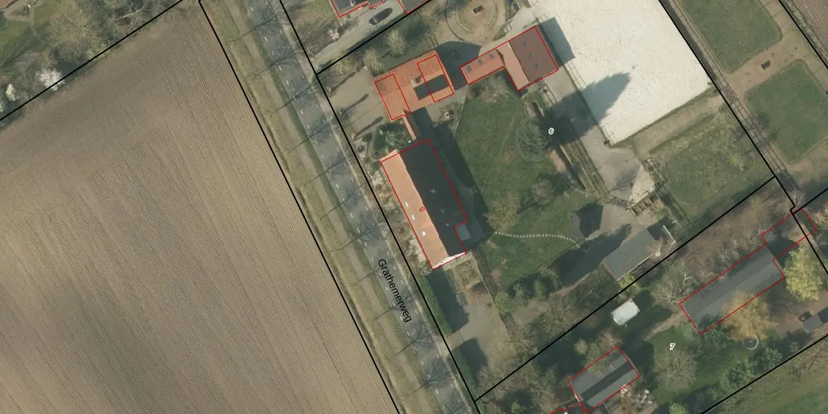 Het perceel waarop Grathemerweg 45 staat heeft een oppervlakte van 7128 m². Dit is een zeer groot perceel. De perceeloppervlakte wordt geregistreerd door het Kadaster. Gedetailleerde informatie over de maten van dit perceel kunt u vinden in het rapport Kadastrale kaart met maatvoering van Grathemerweg 45.