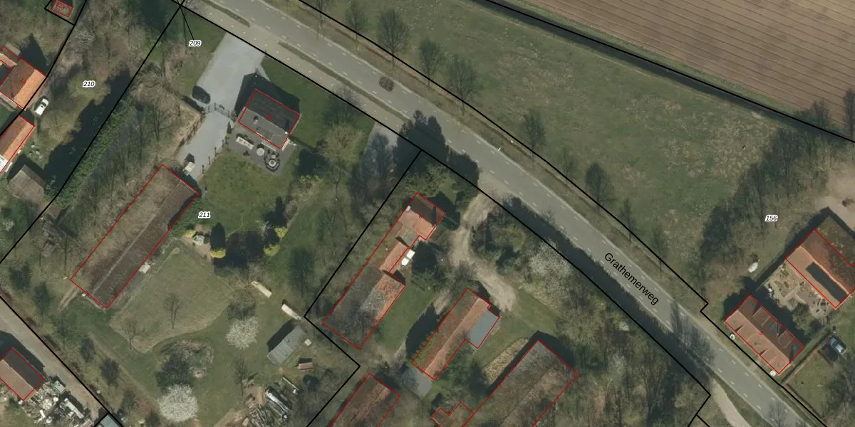 Het perceel waarop Grathemerweg 8 staat heeft een oppervlakte van 8646 m². Dit is een zeer groot perceel. De perceeloppervlakte wordt geregistreerd door het Kadaster. Gedetailleerde informatie over de maten van dit perceel kunt u vinden in het rapport Kadastrale kaart met maatvoering van Grathemerweg 8.