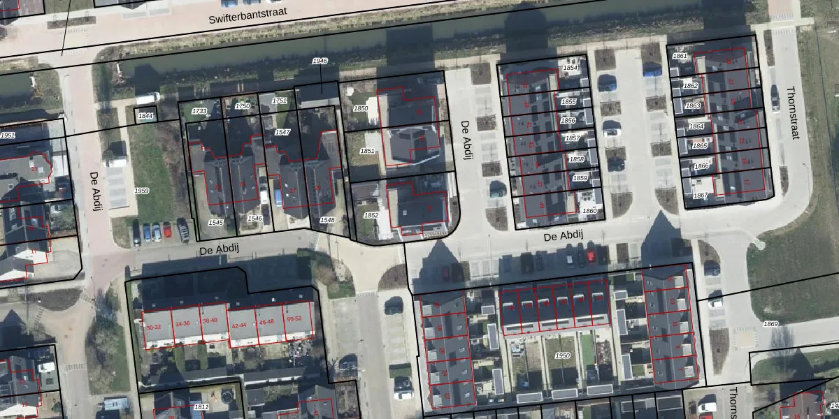 Het perceel waarop De Abdij 31 staat heeft een oppervlakte van 382 m². Dit is een groot perceel. De perceeloppervlakte wordt geregistreerd door het Kadaster. Gedetailleerde informatie over de maten van dit perceel kunt u vinden in het rapport Kadastrale kaart met maatvoering van De Abdij 31.