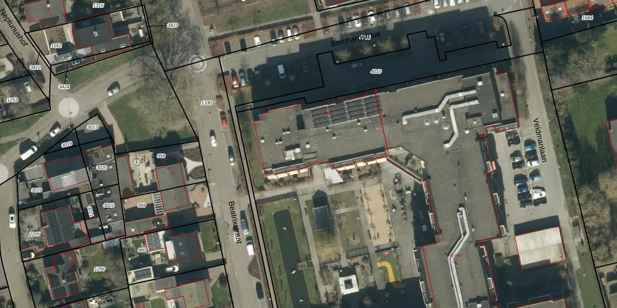 Het perceel waarop Beatrixstraat 1 staat heeft een oppervlakte van 1,2 ha. Dit is een zeer groot perceel. De perceeloppervlakte wordt geregistreerd door het Kadaster. Gedetailleerde informatie over de maten van dit perceel kunt u vinden in het rapport Kadastrale kaart met maatvoering van Beatrixstraat 1.