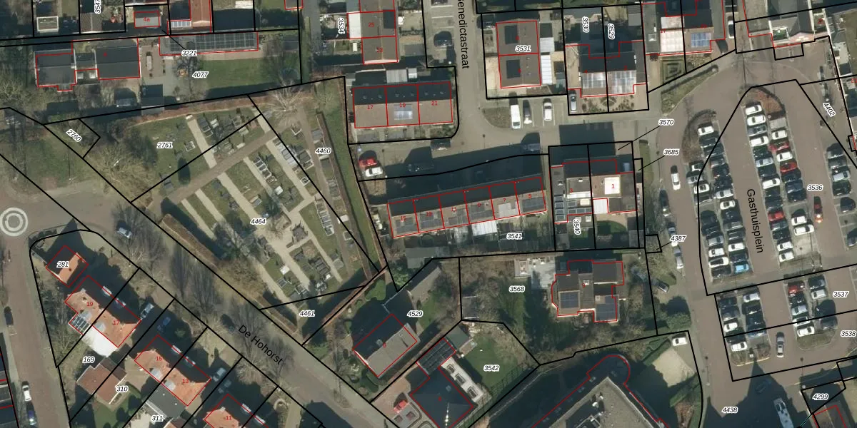 Benedictastraat 13 is gelegen op kadastraal perceel MDL01K3541. Deze kadastrale aanduiding is uniek en wordt gebruikt door het Kadaster om eigendomsrechten en andere zakelijke rechten vast te leggen. Het perceel maakt onderdeel uit van de kadastrale gemeente Maasdriel.