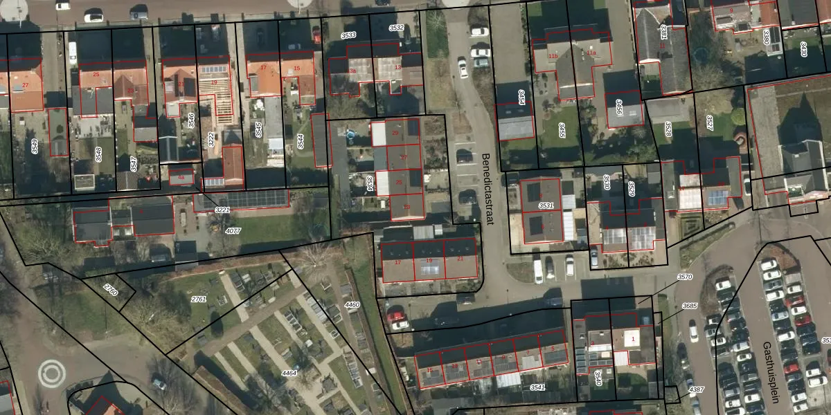 Benedictastraat 23 is gelegen op kadastraal perceel MDL01K3534. Deze kadastrale aanduiding is uniek en wordt gebruikt door het Kadaster om eigendomsrechten en andere zakelijke rechten vast te leggen. Het perceel maakt onderdeel uit van de kadastrale gemeente Maasdriel.