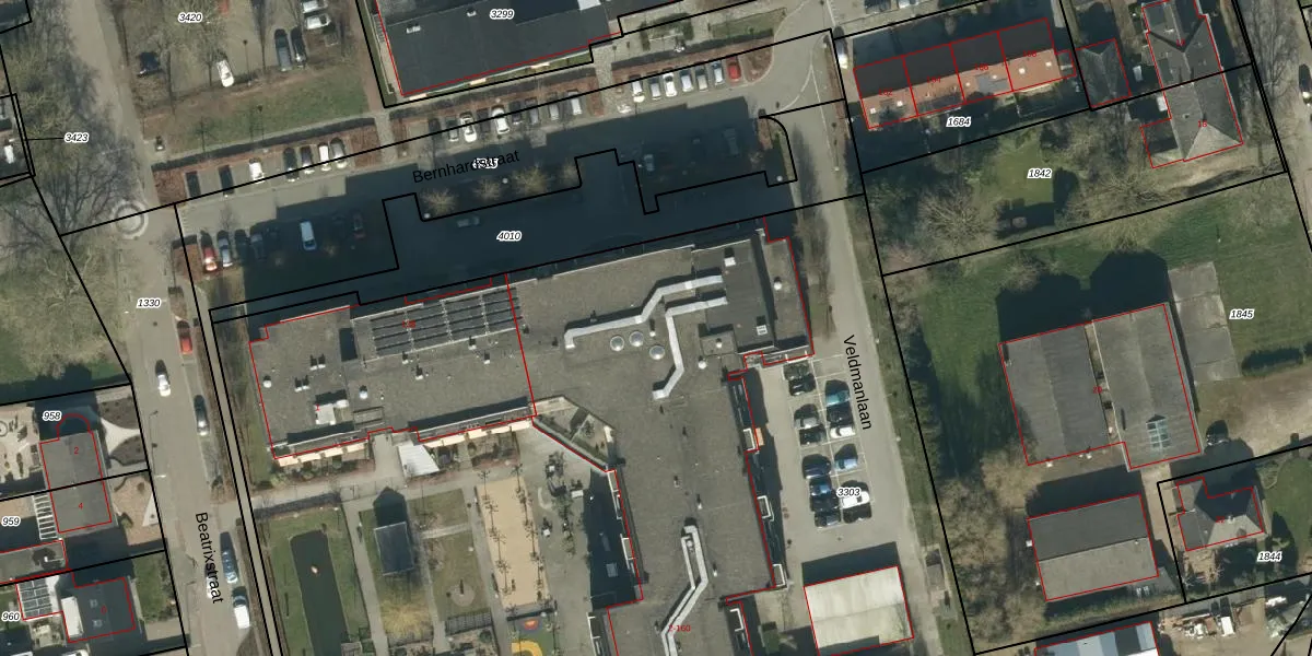 Het perceel waarop Bernhardstraat 102 staat heeft een oppervlakte van 1,2 ha. Dit is een zeer groot perceel. De perceeloppervlakte wordt geregistreerd door het Kadaster. Gedetailleerde informatie over de maten van dit perceel kunt u vinden in het rapport Kadastrale kaart met maatvoering van Bernhardstraat 102.
