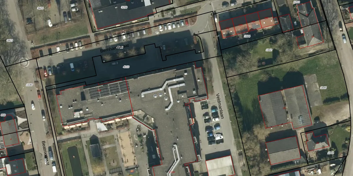 Het perceel waarop Bernhardstraat 104 staat heeft een oppervlakte van 1,2 ha. Dit is een zeer groot perceel. De perceeloppervlakte wordt geregistreerd door het Kadaster. Gedetailleerde informatie over de maten van dit perceel kunt u vinden in het rapport Kadastrale kaart met maatvoering van Bernhardstraat 104.
