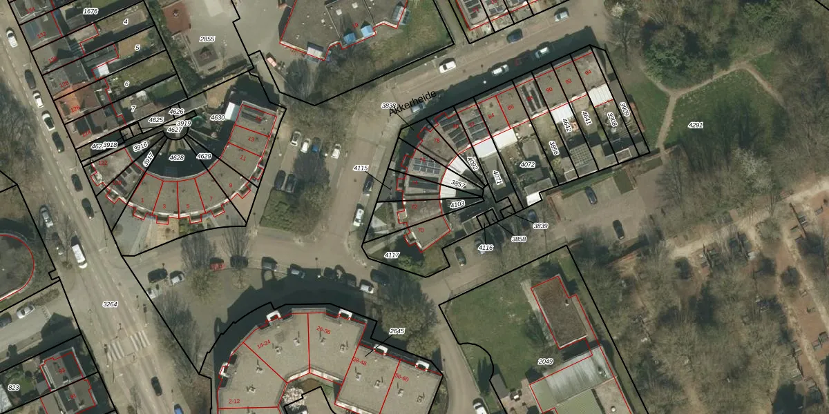 Akkerheide 72 is gelegen op kadastraal perceel KRD00G4103. Deze kadastrale aanduiding is uniek en wordt gebruikt door het Kadaster om eigendomsrechten en andere zakelijke rechten vast te leggen. Het perceel maakt onderdeel uit van de kadastrale gemeente Kerkrade.
