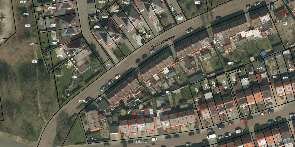 Het perceel waarop Berthradisstraat 22 staat heeft een oppervlakte van 5500 m². Dit is een zeer groot perceel. De perceeloppervlakte wordt geregistreerd door het Kadaster. Gedetailleerde informatie over de maten van dit perceel kunt u vinden in het rapport Kadastrale kaart met maatvoering van Berthradisstraat 22.