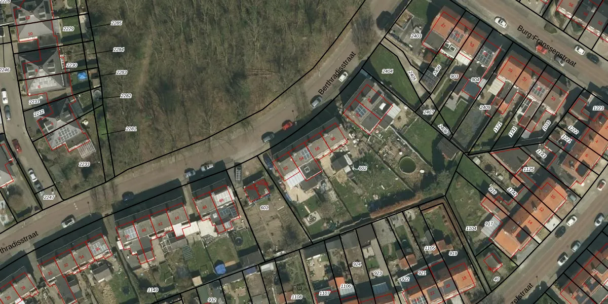 Het perceel waarop Berthradisstraat 54 staat heeft een oppervlakte van 2150 m². Dit is een zeer groot perceel. De perceeloppervlakte wordt geregistreerd door het Kadaster. Gedetailleerde informatie over de maten van dit perceel kunt u vinden in het rapport Kadastrale kaart met maatvoering van Berthradisstraat 54.
