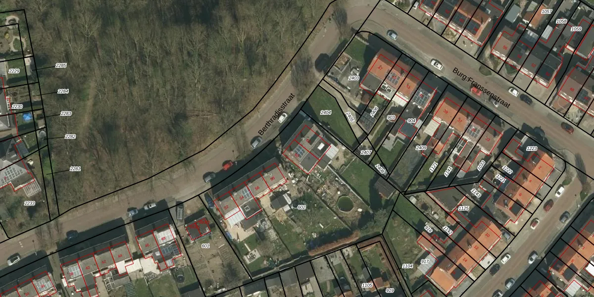 Het perceel waarop Berthradisstraat 60 staat heeft een oppervlakte van 2150 m². Dit is een zeer groot perceel. De perceeloppervlakte wordt geregistreerd door het Kadaster. Gedetailleerde informatie over de maten van dit perceel kunt u vinden in het rapport Kadastrale kaart met maatvoering van Berthradisstraat 60.