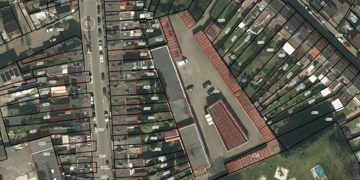 Het perceel waarop Bleijerheiderstraat 59-D staat heeft een oppervlakte van 4176 m². Dit is een zeer groot perceel. De perceeloppervlakte wordt geregistreerd door het Kadaster. Gedetailleerde informatie over de maten van dit perceel kunt u vinden in het rapport Kadastrale kaart met maatvoering van Bleijerheiderstraat 59-D.