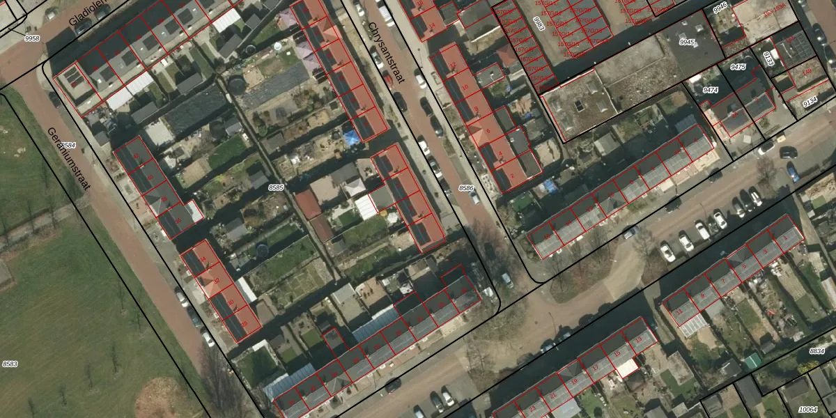 Het perceel waarop Chrysantstraat 3 staat heeft een oppervlakte van 7474 m². Dit is een zeer groot perceel. De perceeloppervlakte wordt geregistreerd door het Kadaster. Gedetailleerde informatie over de maten van dit perceel kunt u vinden in het rapport Kadastrale kaart met maatvoering van Chrysantstraat 3.