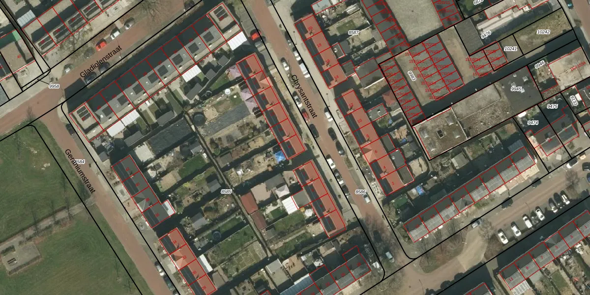 Chrysantstraat 9 is gelegen op kadastraal perceel KRD00D8585. Deze kadastrale aanduiding is uniek en wordt gebruikt door het Kadaster om eigendomsrechten en andere zakelijke rechten vast te leggen. Het perceel maakt onderdeel uit van de kadastrale gemeente Kerkrade.