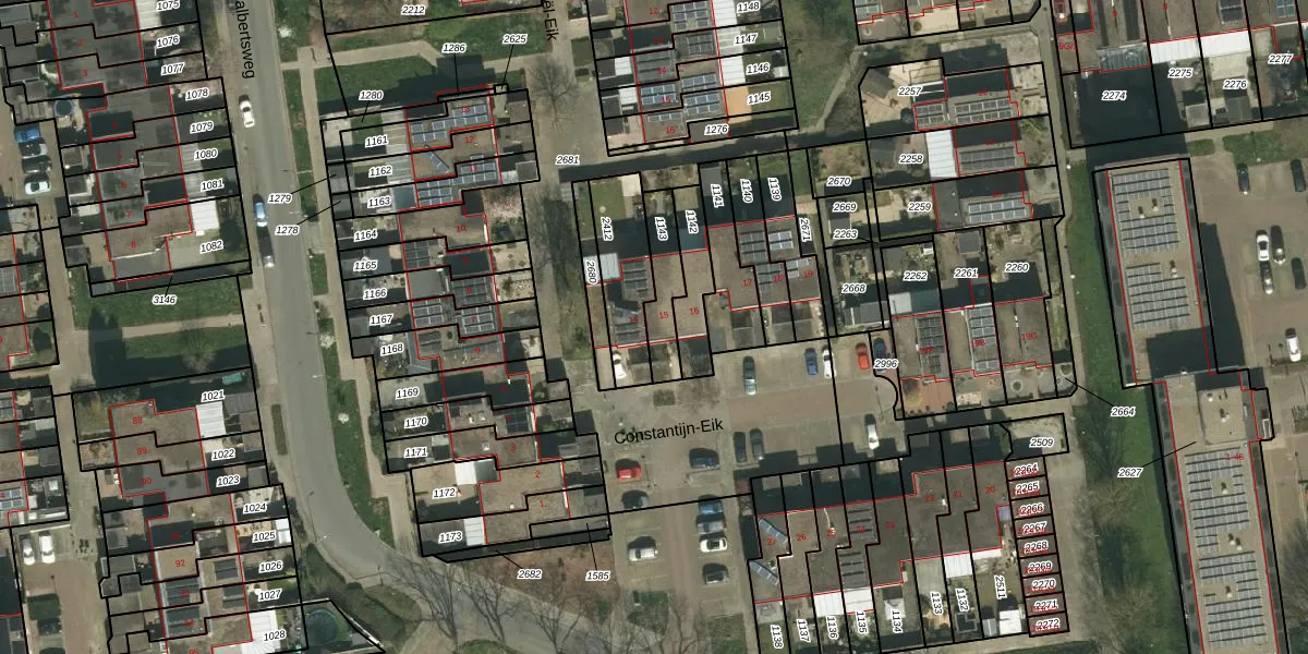Constantijn-Eik 15 is gelegen op kadastraal perceel KRD00K1143. Deze kadastrale aanduiding is uniek en wordt gebruikt door het Kadaster om eigendomsrechten en andere zakelijke rechten vast te leggen. Het perceel maakt onderdeel uit van de kadastrale gemeente Kerkrade.