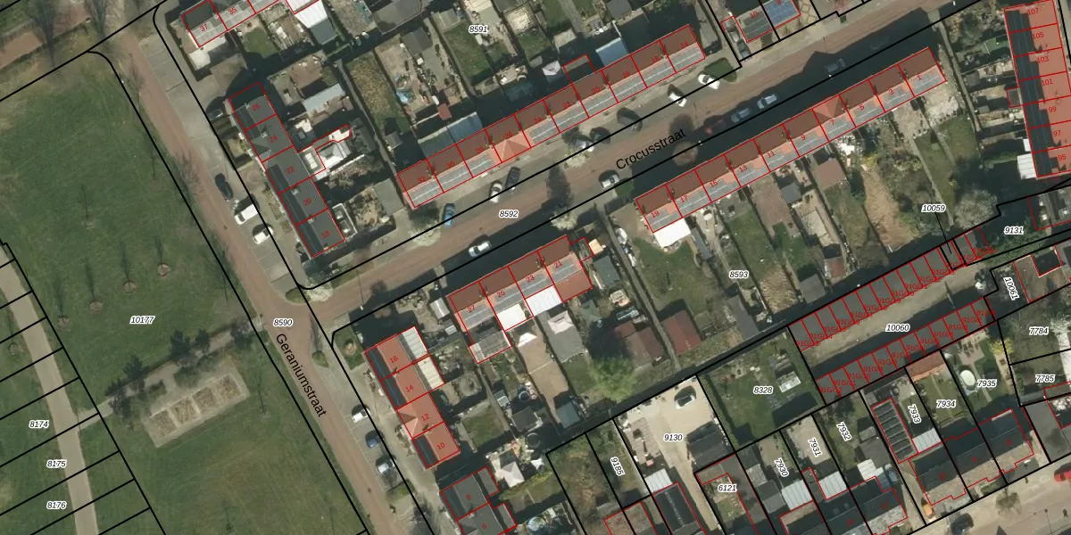 Het perceel waarop Crocusstraat 23 staat heeft een oppervlakte van 6595 m². Dit is een zeer groot perceel. De perceeloppervlakte wordt geregistreerd door het Kadaster. Gedetailleerde informatie over de maten van dit perceel kunt u vinden in het rapport Kadastrale kaart met maatvoering van Crocusstraat 23.