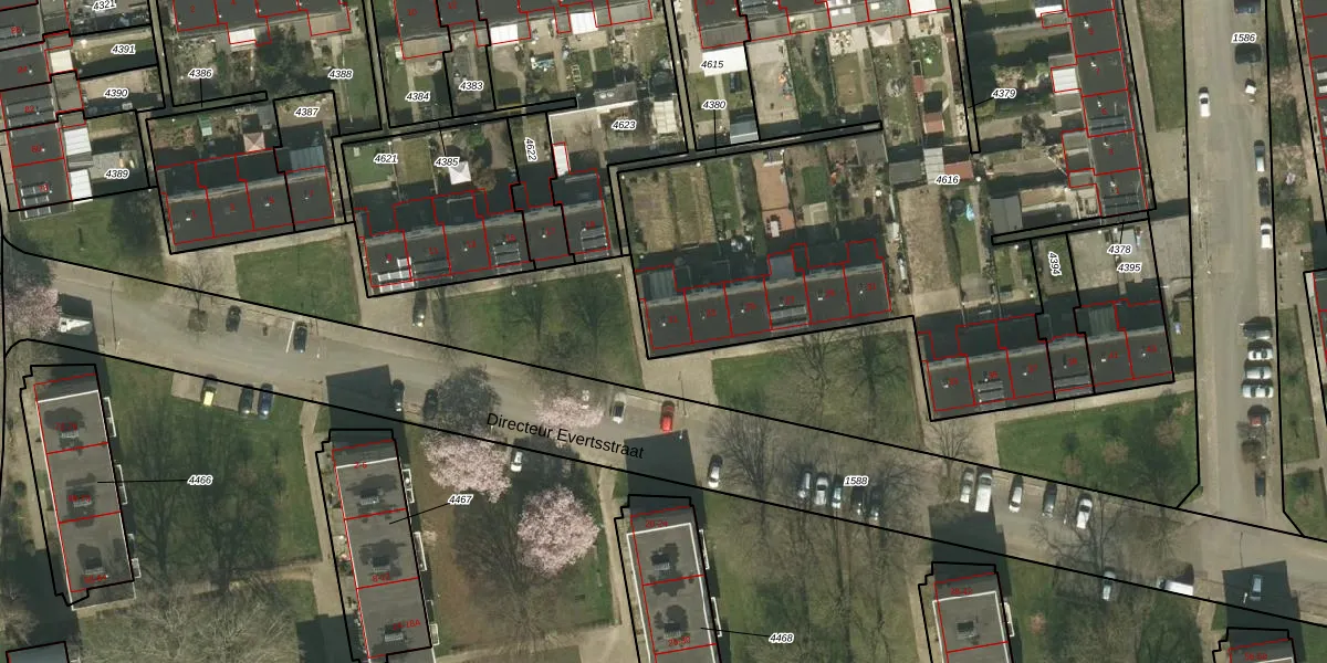 Directeur Evertsstraat 21 is gelegen op kadastraal perceel KRD00G4616. Deze kadastrale aanduiding is uniek en wordt gebruikt door het Kadaster om eigendomsrechten en andere zakelijke rechten vast te leggen. Het perceel maakt onderdeel uit van de kadastrale gemeente Kerkrade.