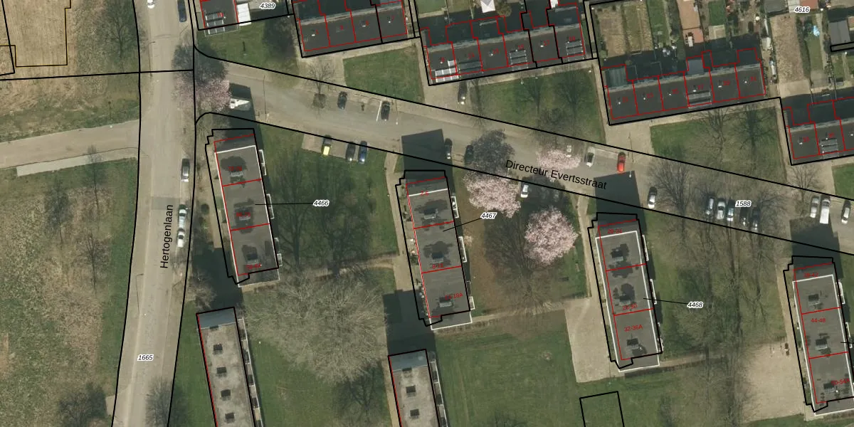 Directeur Evertsstraat 6 is gelegen op kadastraal perceel KRD00G4467. Deze kadastrale aanduiding is uniek en wordt gebruikt door het Kadaster om eigendomsrechten en andere zakelijke rechten vast te leggen. Het perceel maakt onderdeel uit van de kadastrale gemeente Kerkrade.