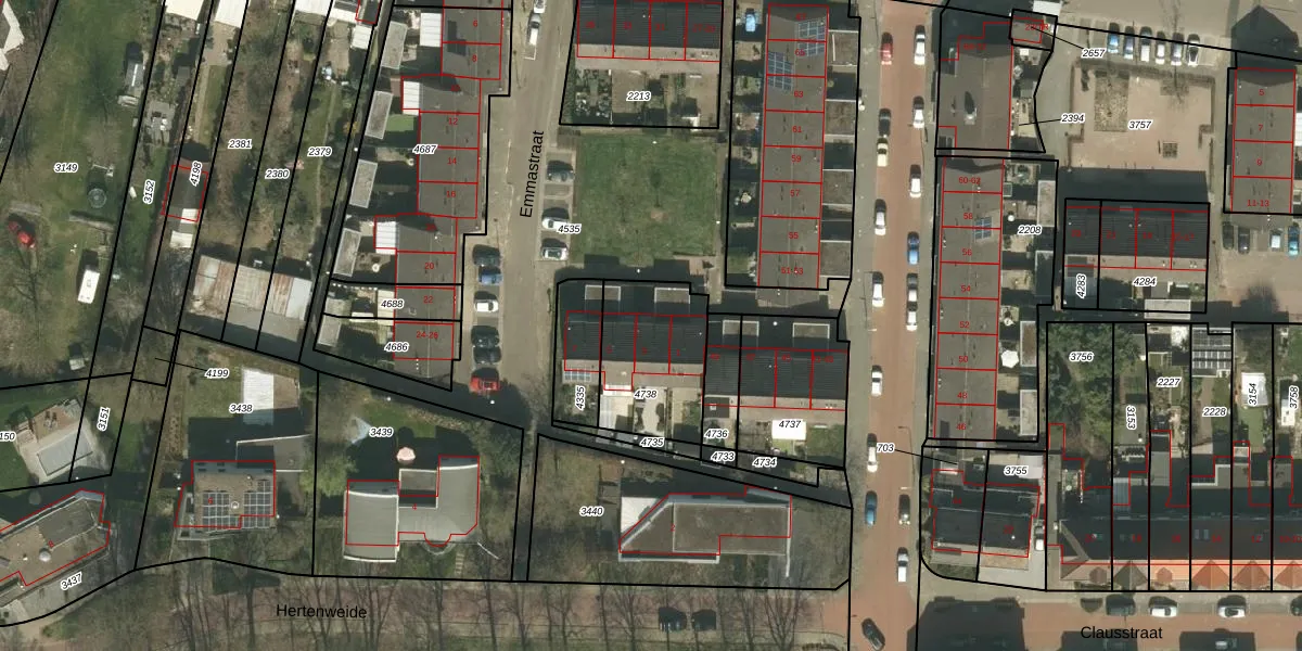 Emmastraat 3 is gelegen op kadastraal perceel KRD00G4738. Deze kadastrale aanduiding is uniek en wordt gebruikt door het Kadaster om eigendomsrechten en andere zakelijke rechten vast te leggen. Het perceel maakt onderdeel uit van de kadastrale gemeente Kerkrade.