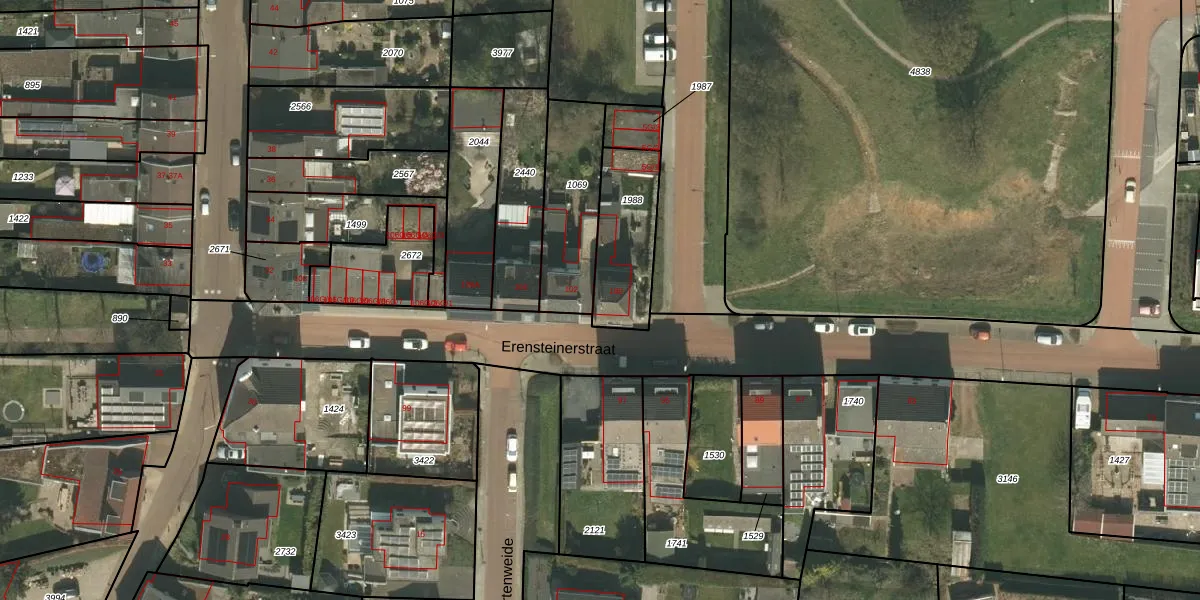 Het perceel waarop Erensteinerstraat 100 staat heeft een oppervlakte van 281 m². Dit is een middelgroot perceel. De perceeloppervlakte wordt geregistreerd door het Kadaster. Gedetailleerde informatie over de maten van dit perceel kunt u vinden in het rapport Kadastrale kaart met maatvoering van Erensteinerstraat 100.