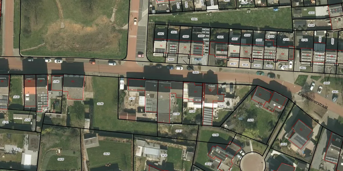 Het perceel waarop Erensteinerstraat 71 staat heeft een oppervlakte van 363 m². Dit is een groot perceel. De perceeloppervlakte wordt geregistreerd door het Kadaster. Gedetailleerde informatie over de maten van dit perceel kunt u vinden in het rapport Kadastrale kaart met maatvoering van Erensteinerstraat 71.