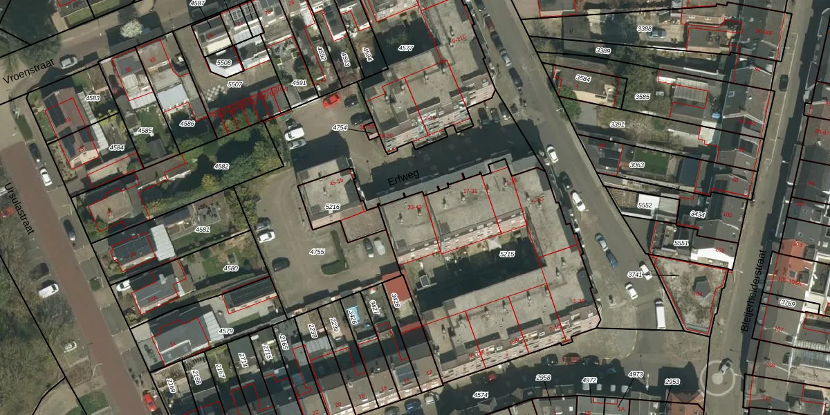 Erfweg 33 is gelegen op kadastraal perceel KRD00F5215. Deze kadastrale aanduiding is uniek en wordt gebruikt door het Kadaster om eigendomsrechten en andere zakelijke rechten vast te leggen. Het perceel maakt onderdeel uit van de kadastrale gemeente Kerkrade.