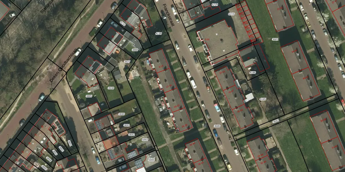 Het perceel waarop Franckstraat 14 staat heeft een oppervlakte van 6450 m². Dit is een zeer groot perceel. De perceeloppervlakte wordt geregistreerd door het Kadaster. Gedetailleerde informatie over de maten van dit perceel kunt u vinden in het rapport Kadastrale kaart met maatvoering van Franckstraat 14.