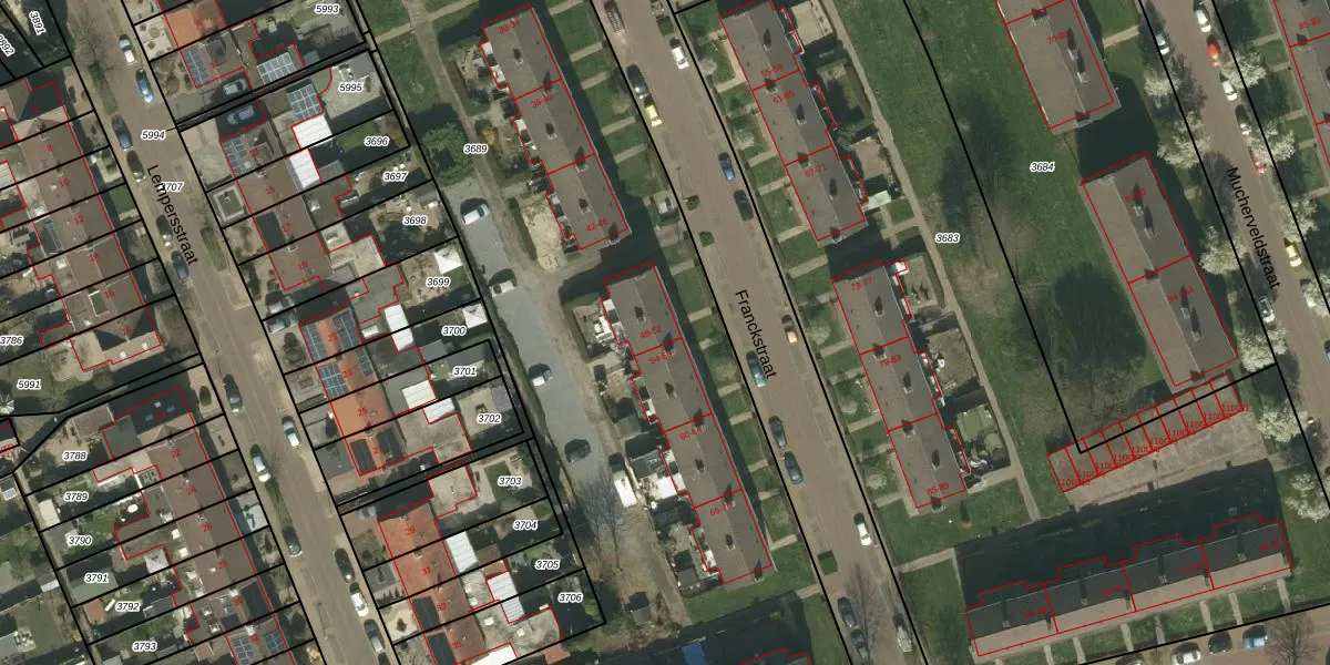 Het perceel waarop Franckstraat 48 staat heeft een oppervlakte van 6450 m². Dit is een zeer groot perceel. De perceeloppervlakte wordt geregistreerd door het Kadaster. Gedetailleerde informatie over de maten van dit perceel kunt u vinden in het rapport Kadastrale kaart met maatvoering van Franckstraat 48.