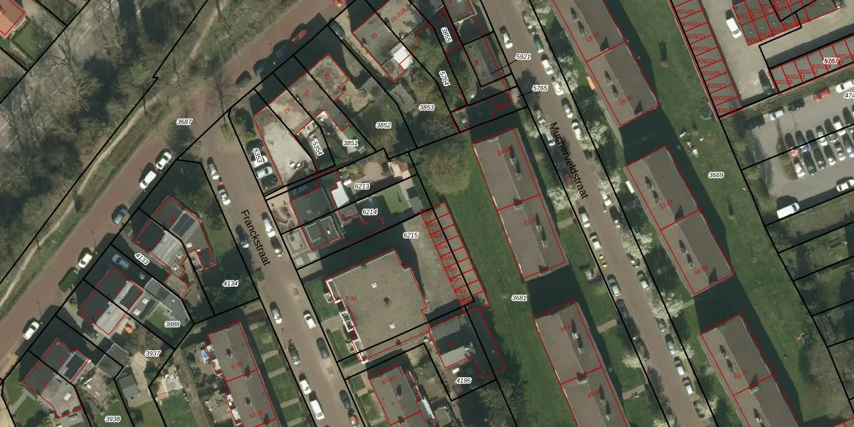 Het perceel waarop Franckstraat 5-G-1 staat heeft een oppervlakte van 837 m². Dit is een groot perceel. De perceeloppervlakte wordt geregistreerd door het Kadaster. Gedetailleerde informatie over de maten van dit perceel kunt u vinden in het rapport Kadastrale kaart met maatvoering van Franckstraat 5-G-1.