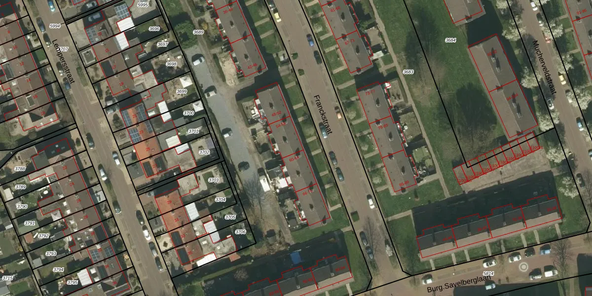 Het perceel waarop Franckstraat 58 staat heeft een oppervlakte van 6450 m². Dit is een zeer groot perceel. De perceeloppervlakte wordt geregistreerd door het Kadaster. Gedetailleerde informatie over de maten van dit perceel kunt u vinden in het rapport Kadastrale kaart met maatvoering van Franckstraat 58.