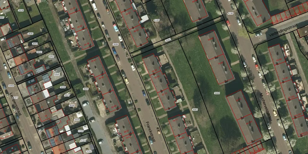 Het perceel waarop Franckstraat 65 staat heeft een oppervlakte van 4770 m². Dit is een zeer groot perceel. De perceeloppervlakte wordt geregistreerd door het Kadaster. Gedetailleerde informatie over de maten van dit perceel kunt u vinden in het rapport Kadastrale kaart met maatvoering van Franckstraat 65.