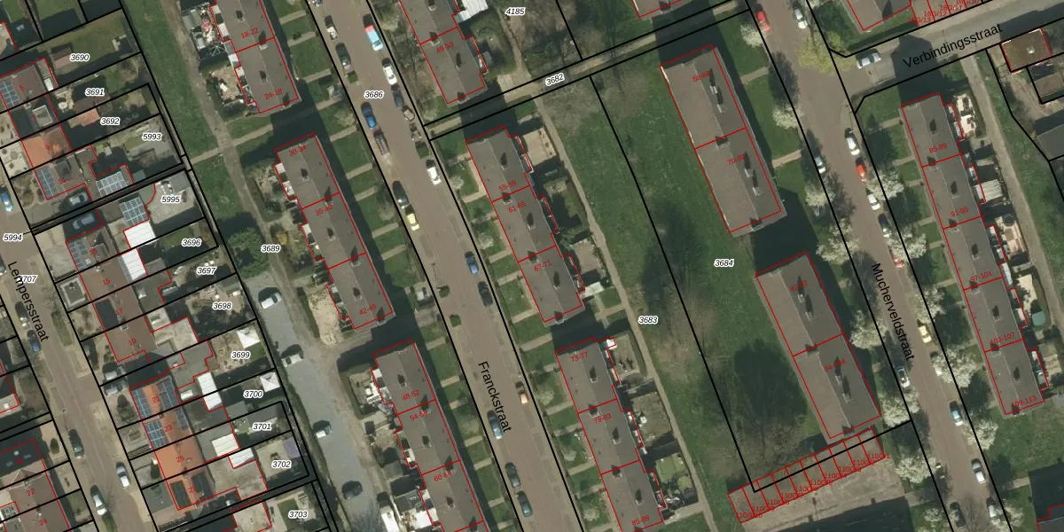 Het perceel waarop Franckstraat 69 staat heeft een oppervlakte van 4770 m². Dit is een zeer groot perceel. De perceeloppervlakte wordt geregistreerd door het Kadaster. Gedetailleerde informatie over de maten van dit perceel kunt u vinden in het rapport Kadastrale kaart met maatvoering van Franckstraat 69.