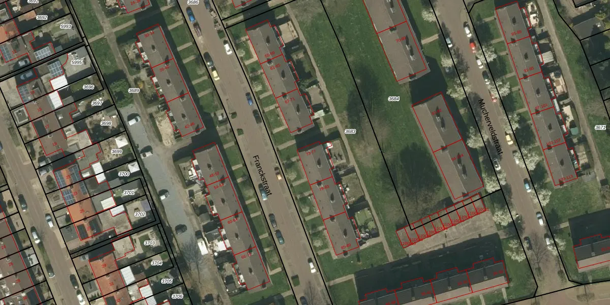 Het perceel waarop Franckstraat 73 staat heeft een oppervlakte van 4770 m². Dit is een zeer groot perceel. De perceeloppervlakte wordt geregistreerd door het Kadaster. Gedetailleerde informatie over de maten van dit perceel kunt u vinden in het rapport Kadastrale kaart met maatvoering van Franckstraat 73.