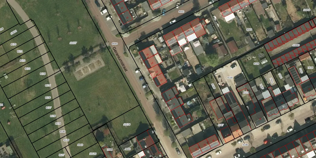 Het perceel waarop Geraniumstraat 10 staat heeft een oppervlakte van 6595 m². Dit is een zeer groot perceel. De perceeloppervlakte wordt geregistreerd door het Kadaster. Gedetailleerde informatie over de maten van dit perceel kunt u vinden in het rapport Kadastrale kaart met maatvoering van Geraniumstraat 10.