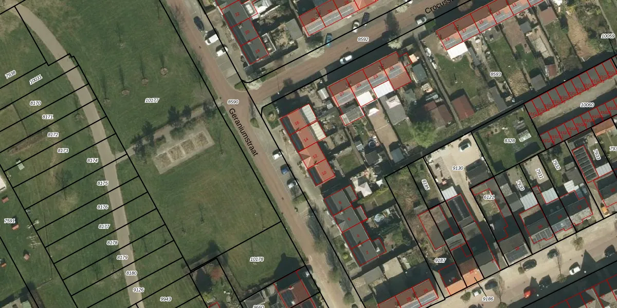 Het perceel waarop Geraniumstraat 12 staat heeft een oppervlakte van 6595 m². Dit is een zeer groot perceel. De perceeloppervlakte wordt geregistreerd door het Kadaster. Gedetailleerde informatie over de maten van dit perceel kunt u vinden in het rapport Kadastrale kaart met maatvoering van Geraniumstraat 12.