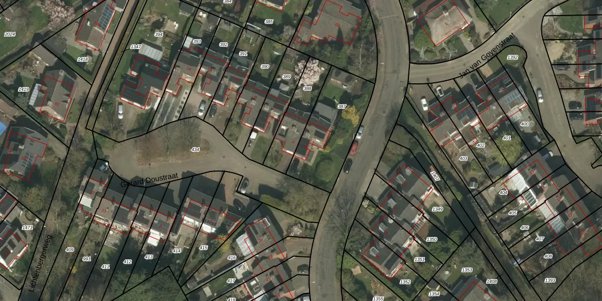 Gerard Doustraat 2 is gelegen op kadastraal perceel KRD00L387. Deze kadastrale aanduiding is uniek en wordt gebruikt door het Kadaster om eigendomsrechten en andere zakelijke rechten vast te leggen. Het perceel maakt onderdeel uit van de kadastrale gemeente Kerkrade.