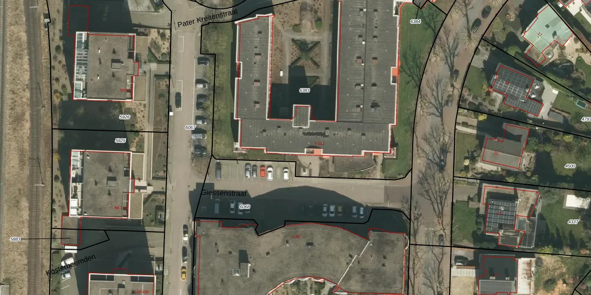 Giessenstraat 98 is gelegen op kadastraal perceel KRD00E6383. Deze kadastrale aanduiding is uniek en wordt gebruikt door het Kadaster om eigendomsrechten en andere zakelijke rechten vast te leggen. Het perceel maakt onderdeel uit van de kadastrale gemeente Kerkrade.