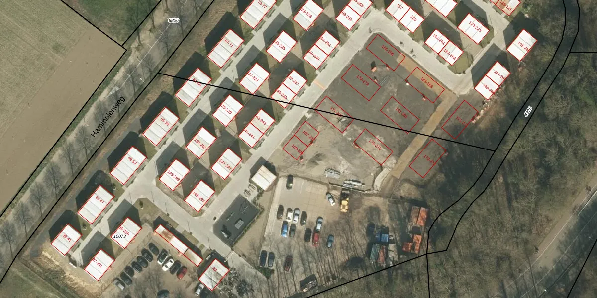 Het perceel waarop Hammolenweg 289 staat heeft een oppervlakte van 1,0 ha. Dit is een zeer groot perceel. De perceeloppervlakte wordt geregistreerd door het Kadaster. Gedetailleerde informatie over de maten van dit perceel kunt u vinden in het rapport Kadastrale kaart met maatvoering van Hammolenweg 289.