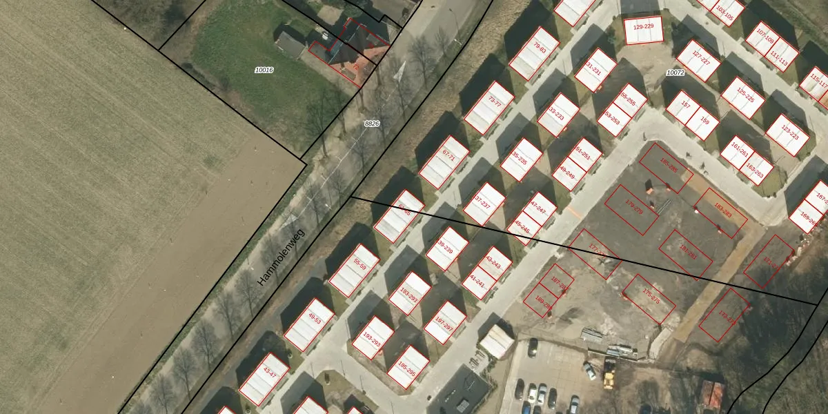 Het perceel waarop Hammolenweg 65 staat heeft een oppervlakte van 1,0 ha. Dit is een zeer groot perceel. De perceeloppervlakte wordt geregistreerd door het Kadaster. Gedetailleerde informatie over de maten van dit perceel kunt u vinden in het rapport Kadastrale kaart met maatvoering van Hammolenweg 65.
