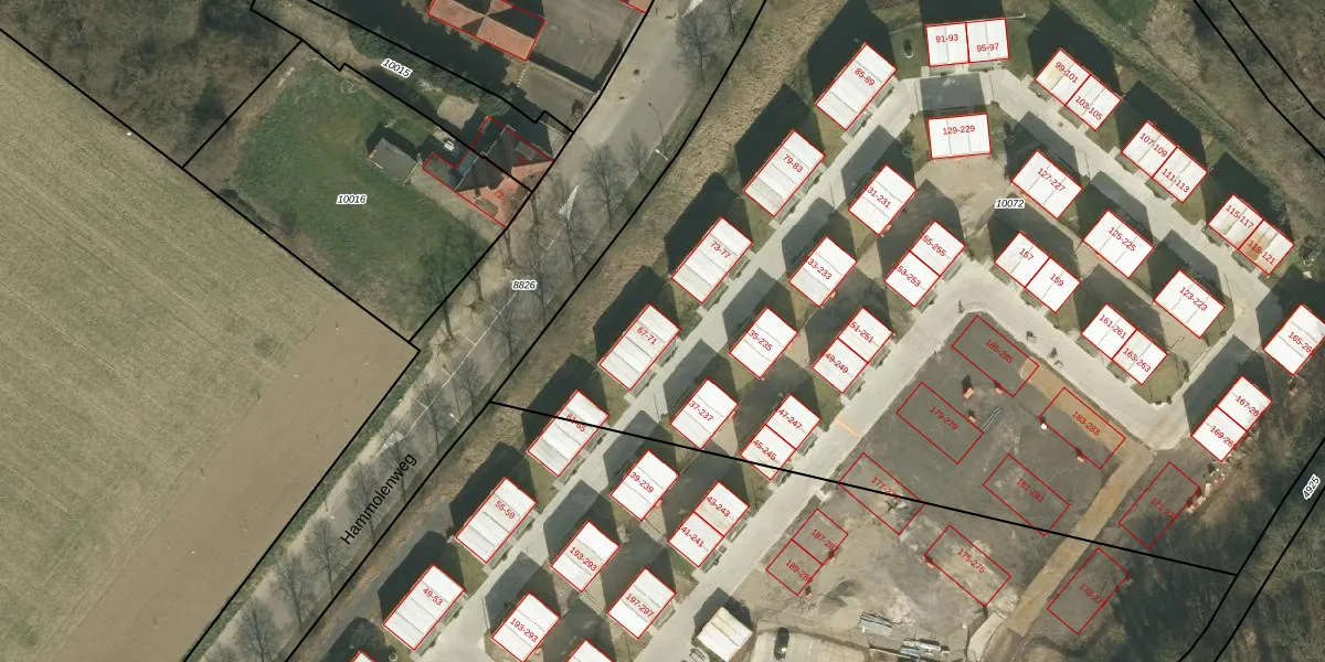 Het perceel waarop Hammolenweg 71 staat heeft een oppervlakte van 1,0 ha. Dit is een zeer groot perceel. De perceeloppervlakte wordt geregistreerd door het Kadaster. Gedetailleerde informatie over de maten van dit perceel kunt u vinden in het rapport Kadastrale kaart met maatvoering van Hammolenweg 71.