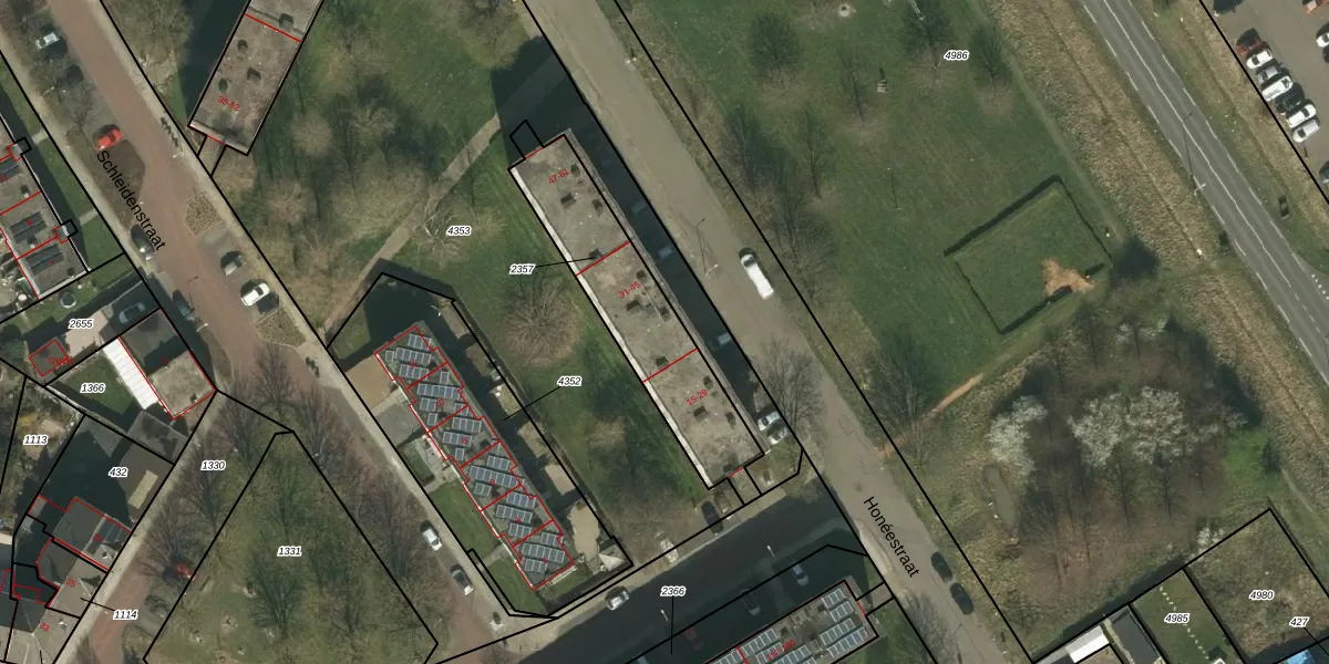 Het perceel waarop Honéestraat 41 staat heeft een oppervlakte van 604 m². Dit is een groot perceel. De perceeloppervlakte wordt geregistreerd door het Kadaster. Gedetailleerde informatie over de maten van dit perceel kunt u vinden in het rapport Kadastrale kaart met maatvoering van Honéestraat 41.