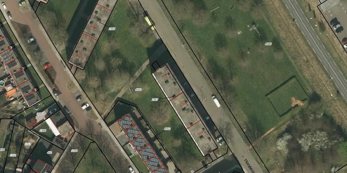 Het perceel waarop Honéestraat 55 staat heeft een oppervlakte van 604 m². Dit is een groot perceel. De perceeloppervlakte wordt geregistreerd door het Kadaster. Gedetailleerde informatie over de maten van dit perceel kunt u vinden in het rapport Kadastrale kaart met maatvoering van Honéestraat 55.