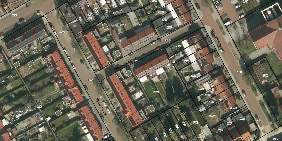 Het perceel waarop Jasmijnstraat 7 staat heeft een oppervlakte van 2078 m². Dit is een zeer groot perceel. De perceeloppervlakte wordt geregistreerd door het Kadaster. Gedetailleerde informatie over de maten van dit perceel kunt u vinden in het rapport Kadastrale kaart met maatvoering van Jasmijnstraat 7.