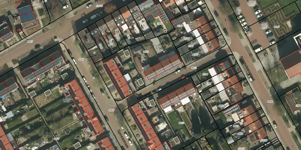 Het perceel waarop Jasmijnstraat 8 staat heeft een oppervlakte van 1482 m². Dit is een zeer groot perceel. De perceeloppervlakte wordt geregistreerd door het Kadaster. Gedetailleerde informatie over de maten van dit perceel kunt u vinden in het rapport Kadastrale kaart met maatvoering van Jasmijnstraat 8.