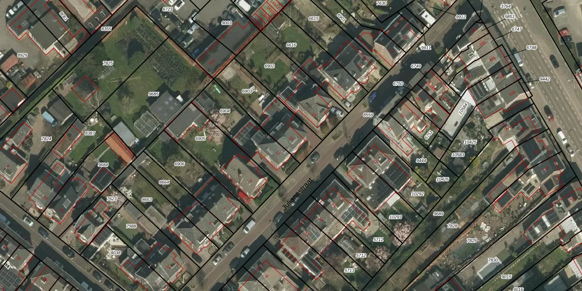 Julianastraat 13 is gelegen op kadastraal perceel KRD00B6903. Deze kadastrale aanduiding is uniek en wordt gebruikt door het Kadaster om eigendomsrechten en andere zakelijke rechten vast te leggen. Het perceel maakt onderdeel uit van de kadastrale gemeente Kerkrade.